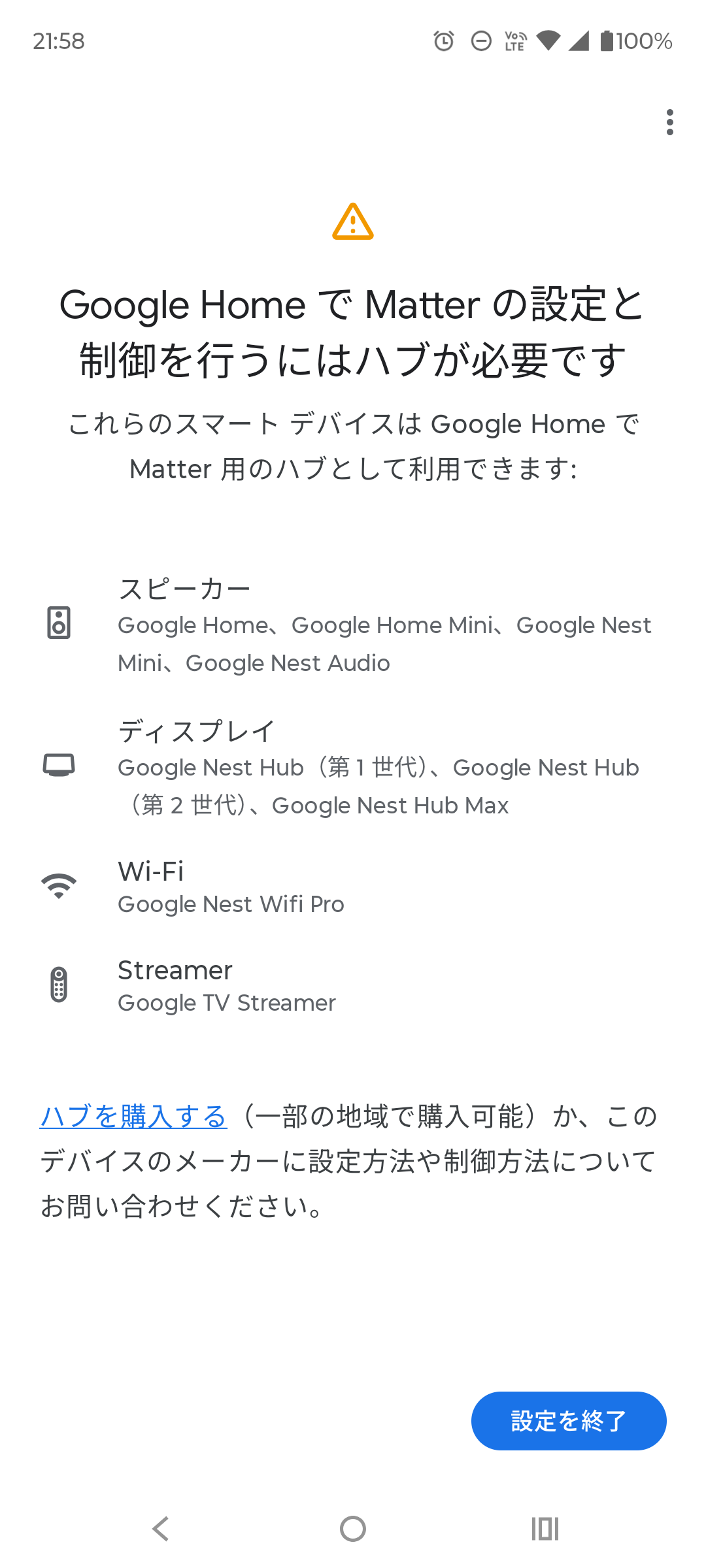それはそれとして、moto g64 5GにインストールされてるGoogle Homeアプリに実際M3ハブを登録しようとしてみたところ、こういう画面が出た。これは多分、Google Home側にも某かハブがないことにはGoogle HomeとM3ハブの連携は取れないですよ、ということなんだと思う。